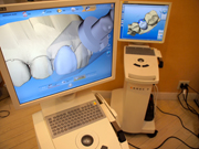 ペン型の小型カメラでお口の中の状態を診療台にある液晶モニターに映し出します。鏡では見えない奥歯の虫歯や歯ぐきの状態が手に取る様に分かり、患者様にも治療の状態を良く理解していただけます。